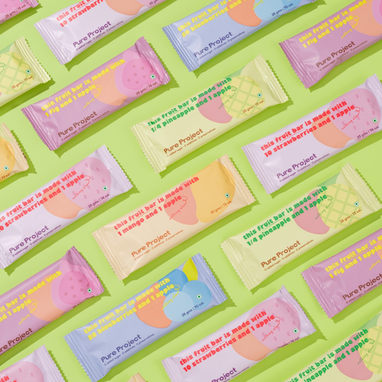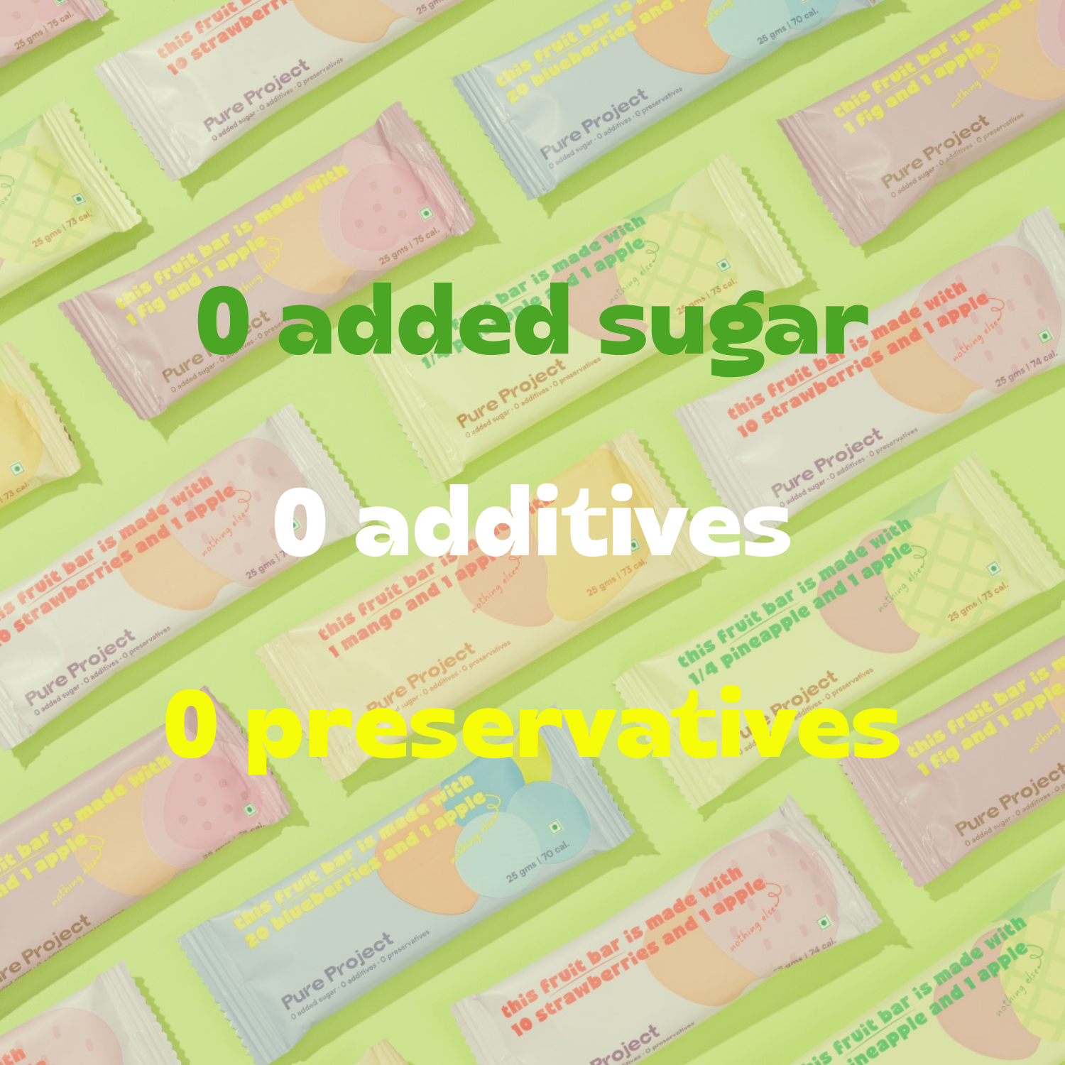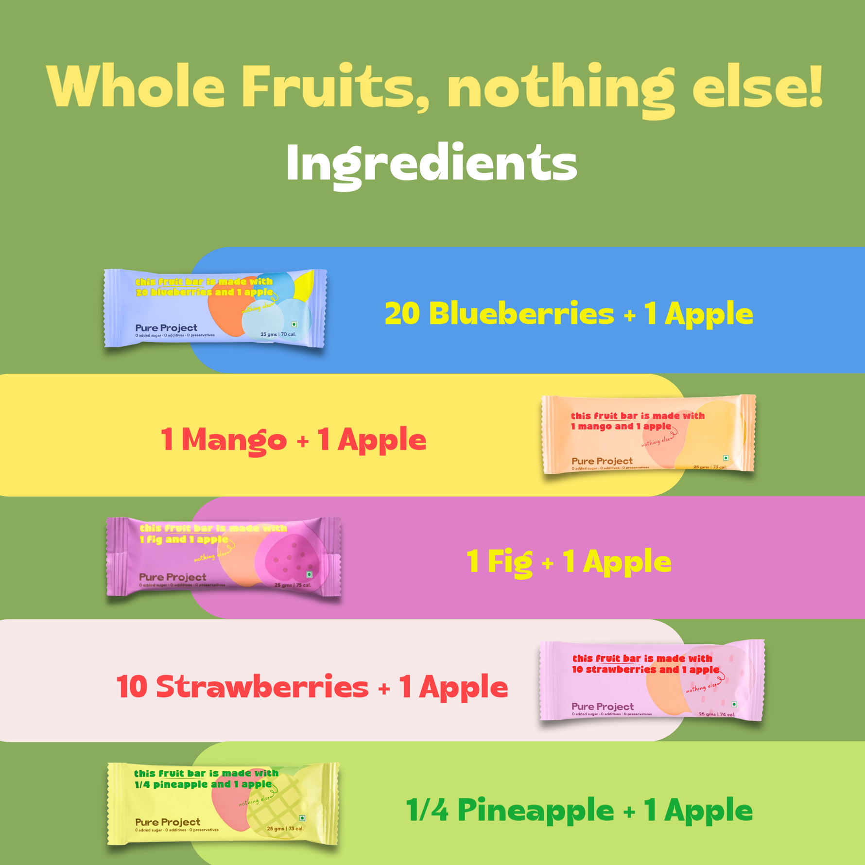 Just fruit. We slow-dry and blend whole fruits to make a naturally sweet, chewy bar. That’s it—0 additives, 0 preservatives, 0 added sugar.