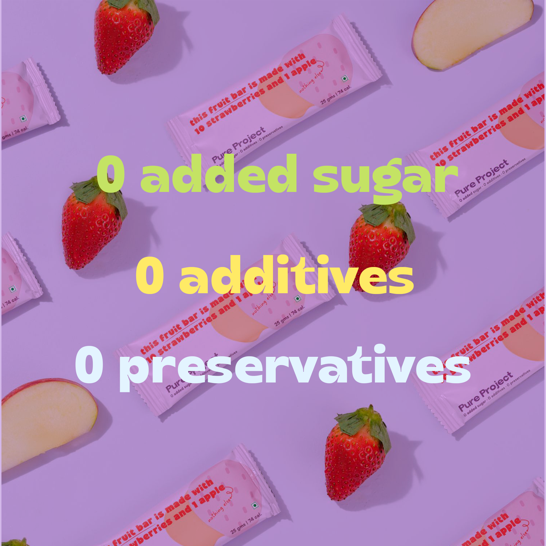 Just fruit. We slow-dry and blend whole fruits to make a naturally sweet, chewy bar. That’s it—0 additives, 0 preservatives, 0 added sugar.