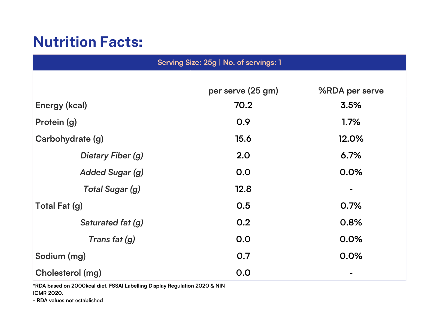 All values are for 1 serving of size 25g; %'s are based on RDA (Recommended Daily Allowance) based on 2000kcal diet. FSSAI Labelling Display Regulation 2020 & NIN ICMR 2020.