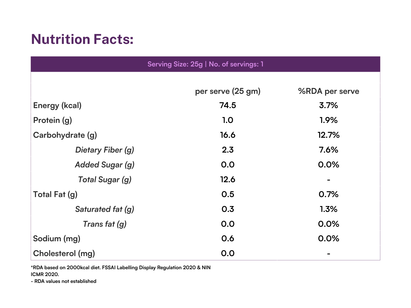 All values are for 1 serving of size 25g; %'s are based on RDA (Recommended Daily Allowance) based on 2000kcal diet. FSSAI Labelling Display Regulation 2020 & NIN ICMR 2020.
