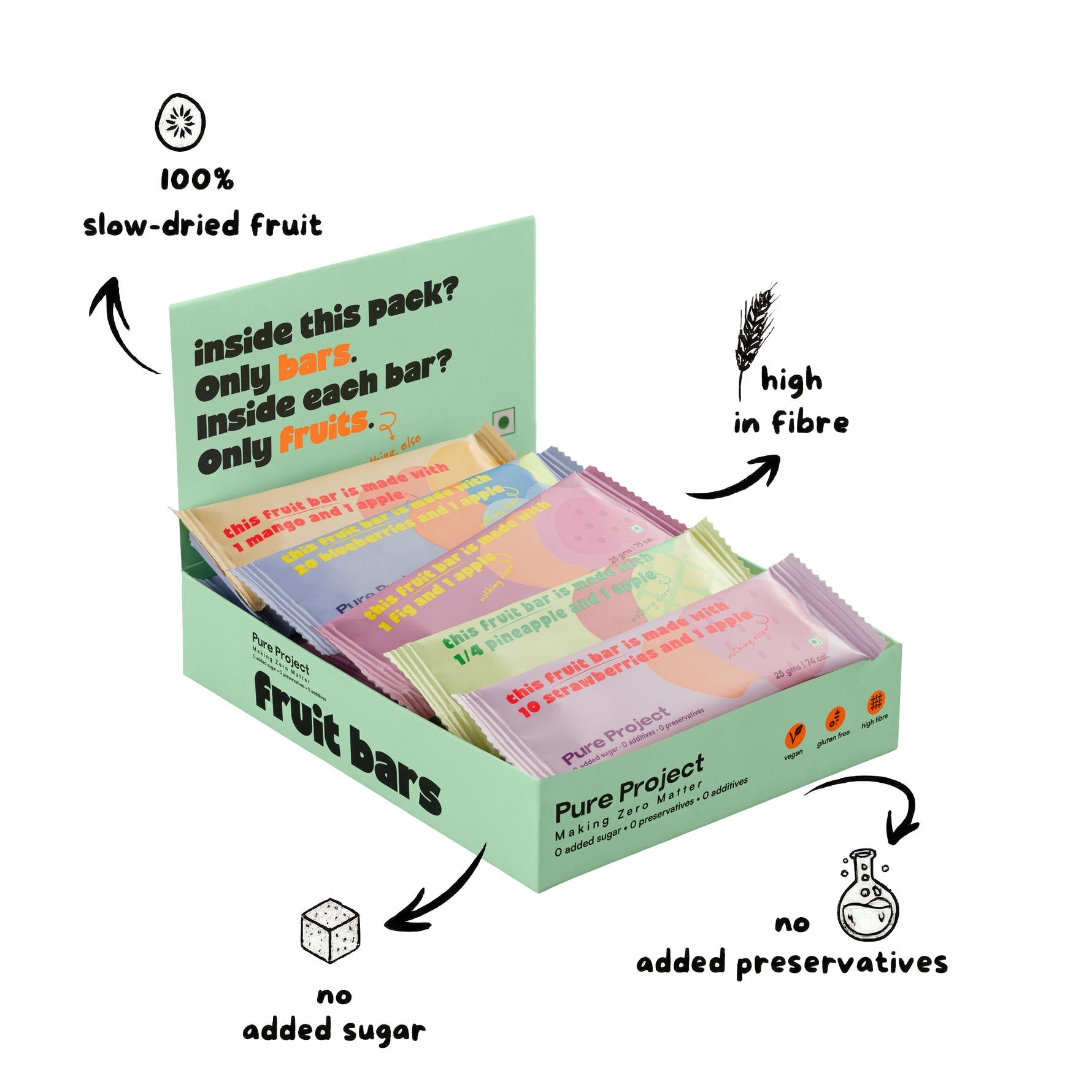 Just fruit. We slow-dry and blend whole fruits to make a naturally sweet, chewy bar. That’s it—0 additives, 0 preservatives, 0 added sugar.